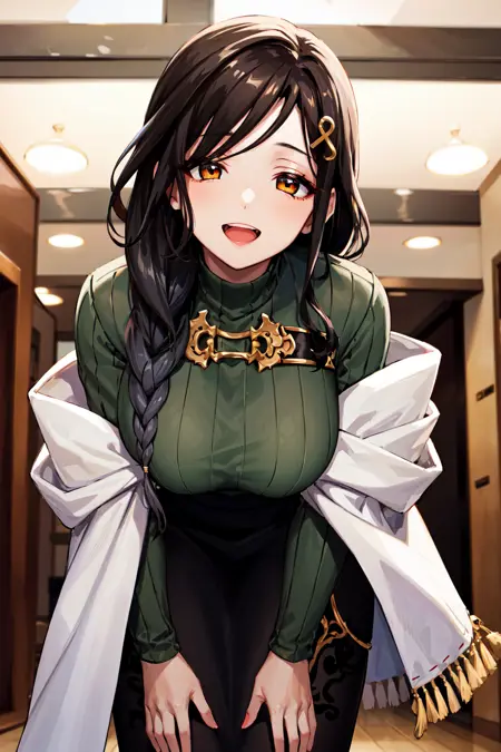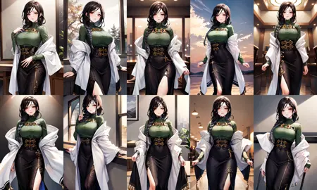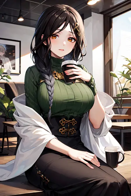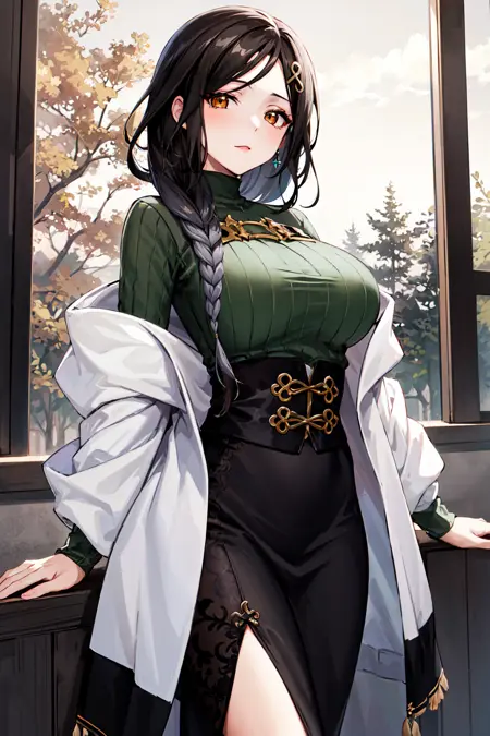 아웃핏1st1, 땋은 머리, 머리 장식, 녹색 스웨터, 검은 치마, 큰 가슴, 긴 치마, 카디건