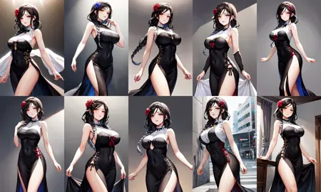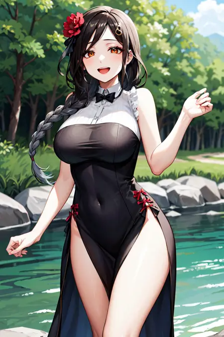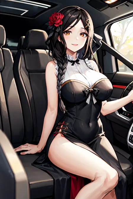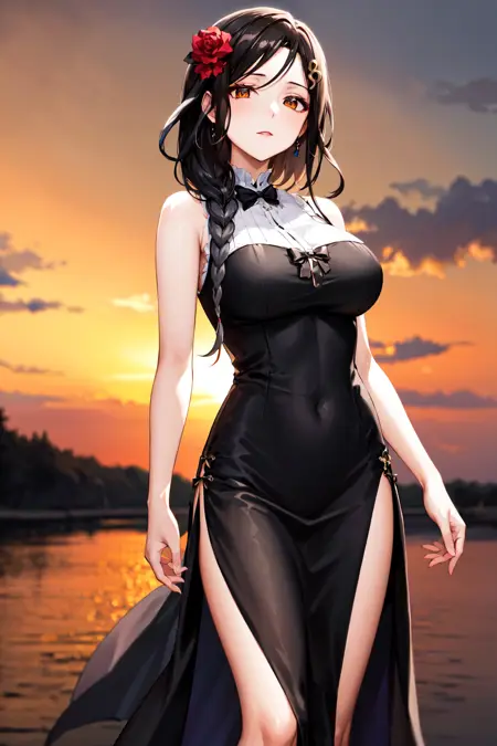아웃핏3st1, 땋은 머리, 머리 장식, 검은 드레스, 머리 꽃, 옆면 슬릿, 큰 가슴, 긴 드레스, 슬리브리스