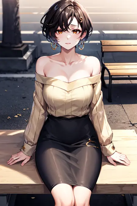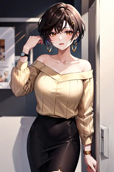 아웃핏2st1, 짧은 머리, 허리밴드 귀걸이, 검은 치마, 손목시계, 어깨나온 스웨터, 연필 치마, 거목, 큰 가슴