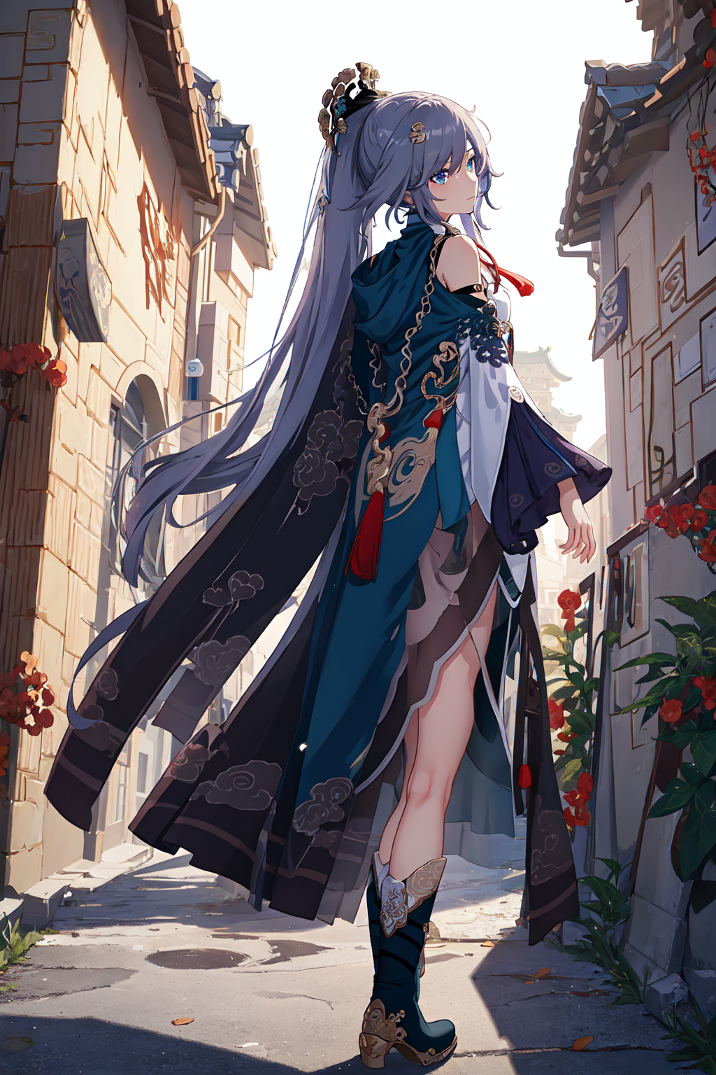 Azure Empyrea, 1girl, Chinese clothes, long hair, footwear, hair over one eye,