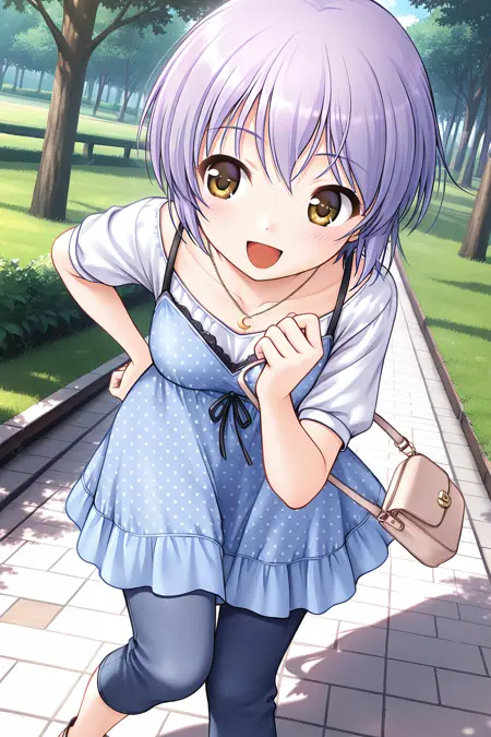 casual,light purple shirt,white shirt,collarbone,oblong neck,pendant,short sleeves,blue dress,blue camisole,short dress,polka dot dress,spaghetti strap,camisole over clothes,waist ribbon,black ribbon,jeans,denim,