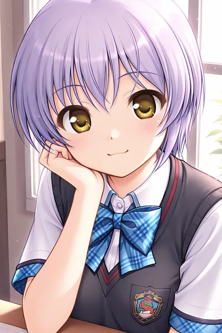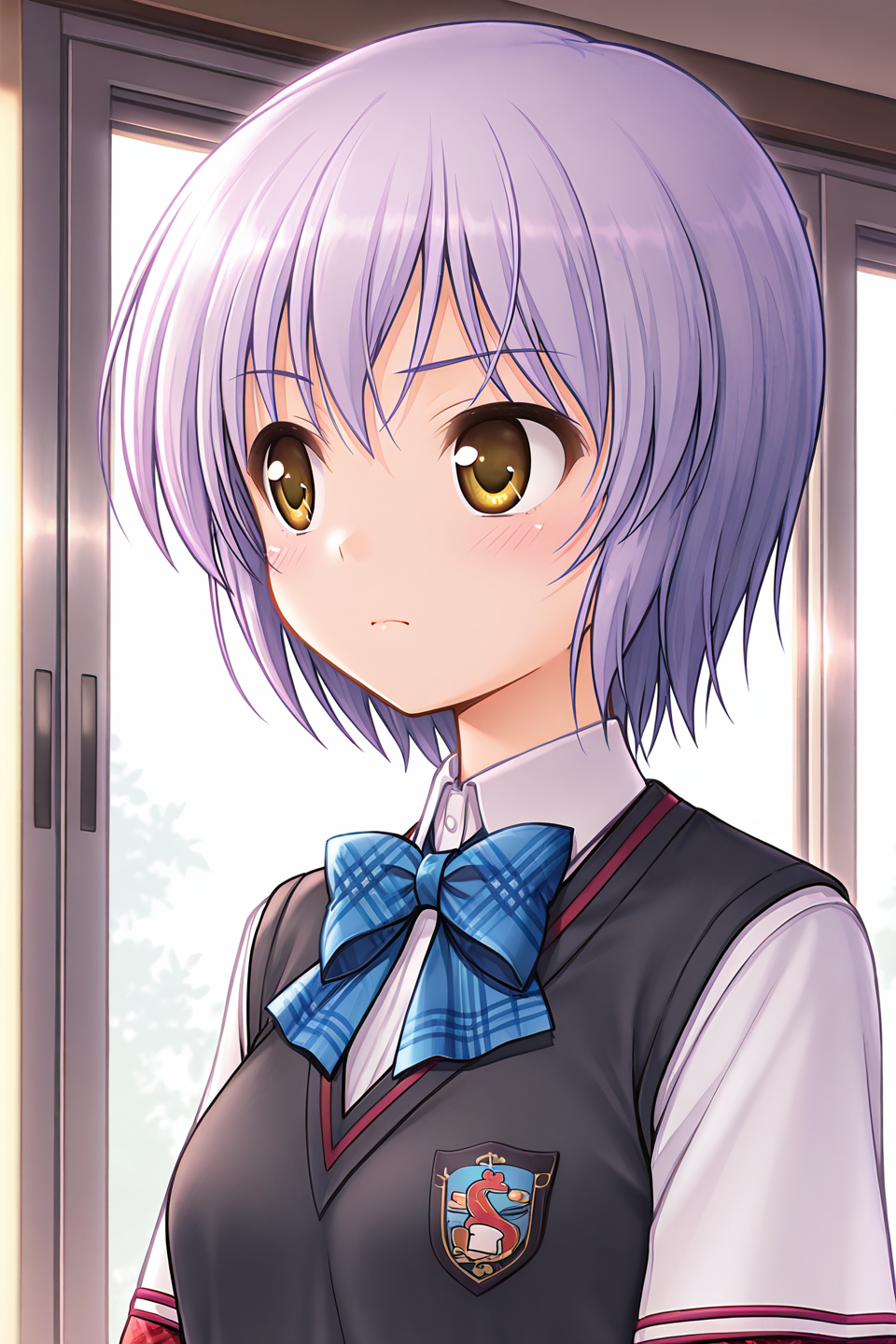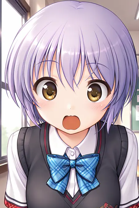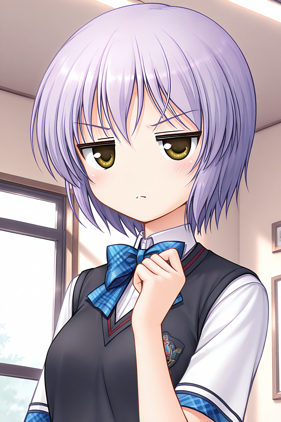 misono senri, yellow eyes, brown eyes, purple hair, short hair, bangs,
