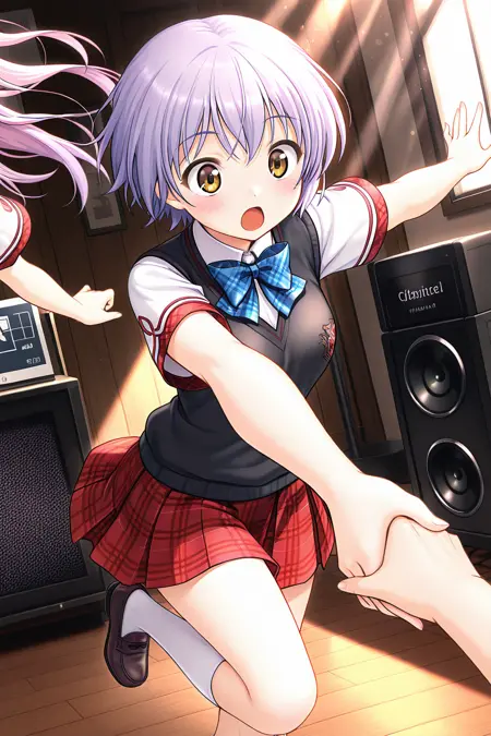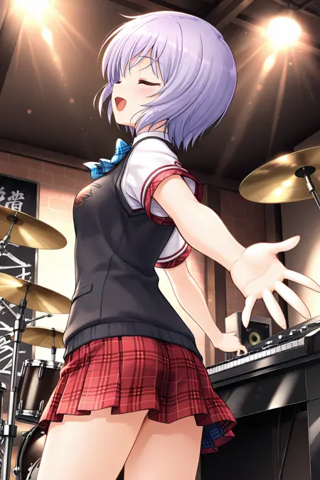 school uniform, shirt, white shirt, vest, sweater vest, black vest, short sleeves, skirt, red skirt, pleated skirt, plaid, plaid skirt, miniskirt, bare legs,