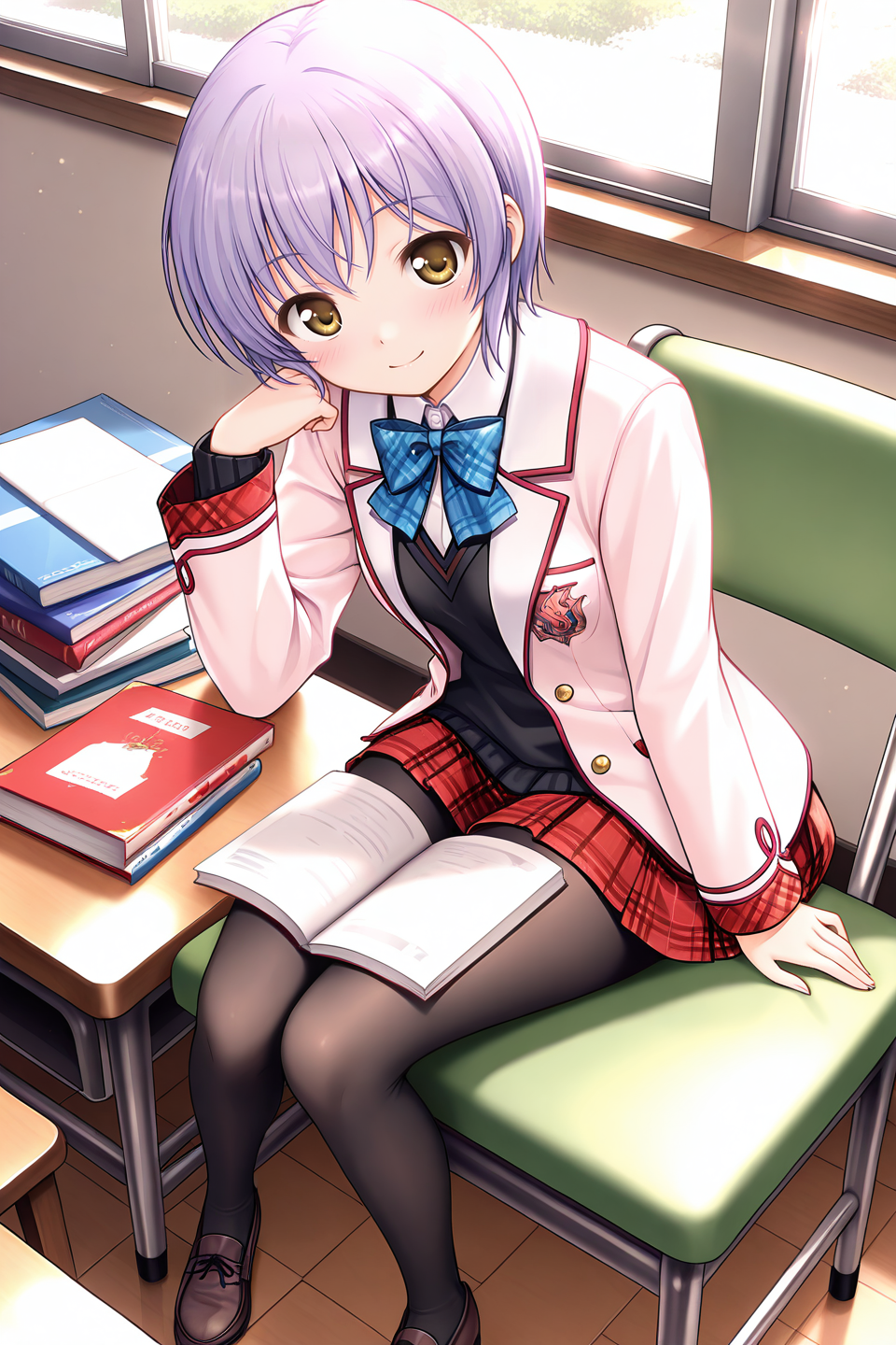 school uniform, jacket, long sleeves, skirt, plaid, plaid skirt, serafuku, pantyhose, black pantyhose, shoes,
