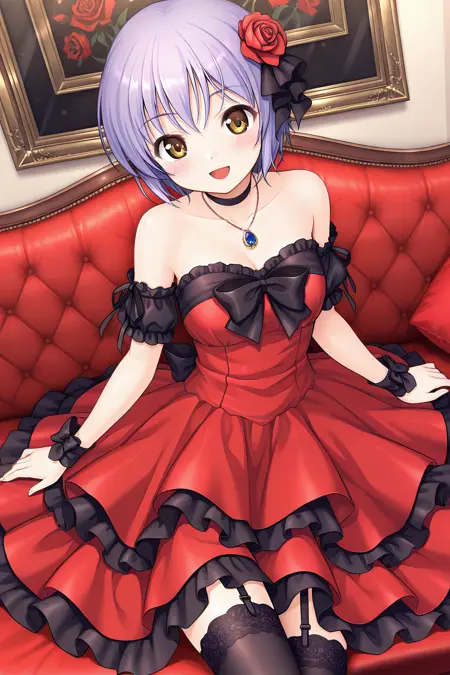 hair ornament, hair flower, flower, rose, choker, bare shoulders, strapless, cleavage, dress, frills, red dress, ribbon, black ribbon, skirt, thighhighs, black thighhighs, arm ribbon, lace, lace trim, lace-trimmed legwear, garter belt, garter straps, necklace, jewelry, pendant, collarbone,