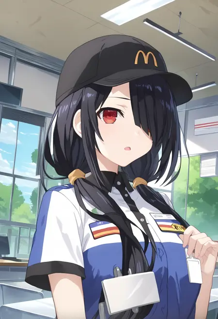 mcuniform, mchat, 직원 유니폼, 야구 모자, 검정 머리장식,
