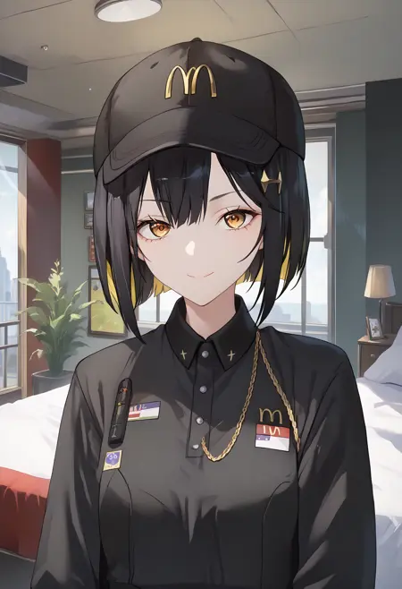 mcuniform, mchat, 직원 유니폼, 야구 모자, 검정 머리장식, 검정 셔츠, 검정 반바지,
