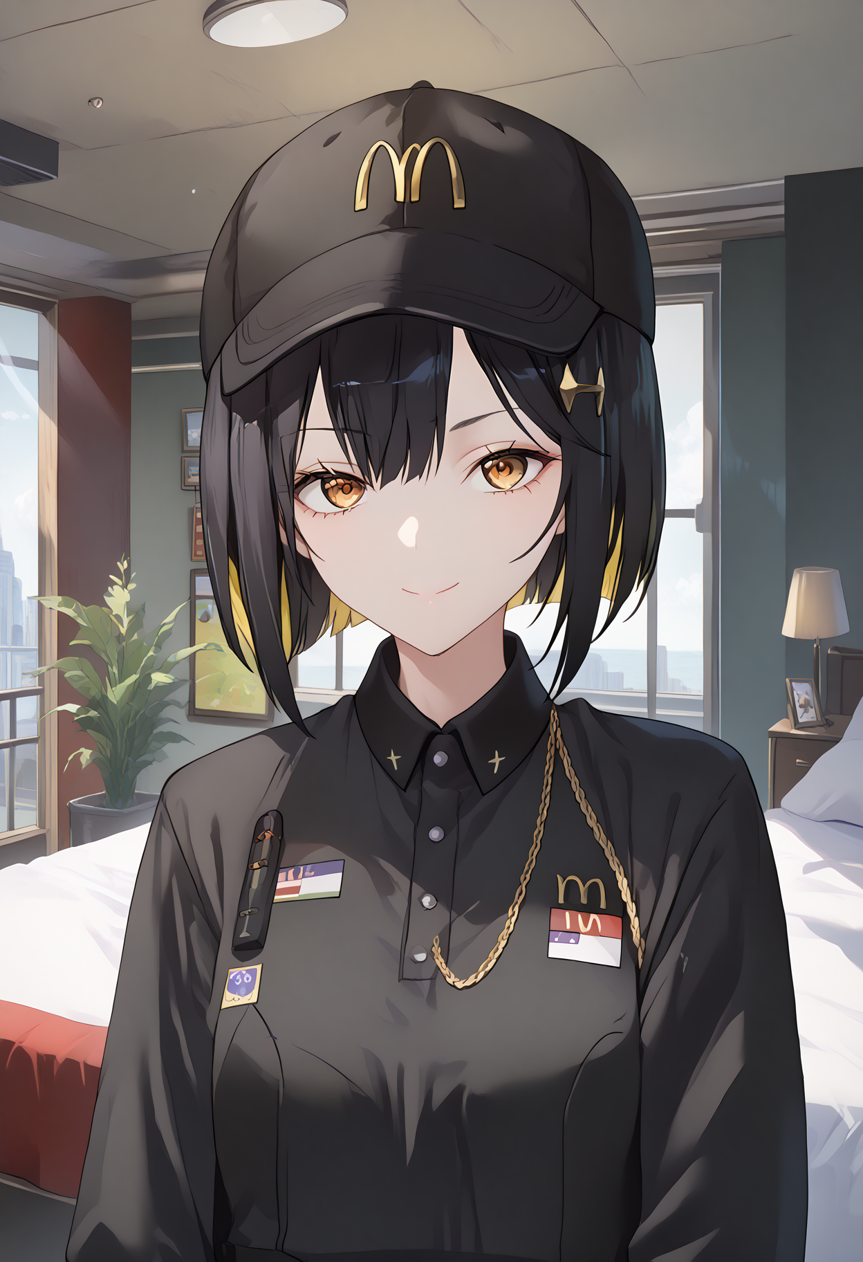 • mcuniform, mchat, 직원 유니폼, 야구 모자, 검정 머리장식, 검정 셔츠, 검정 반바지,