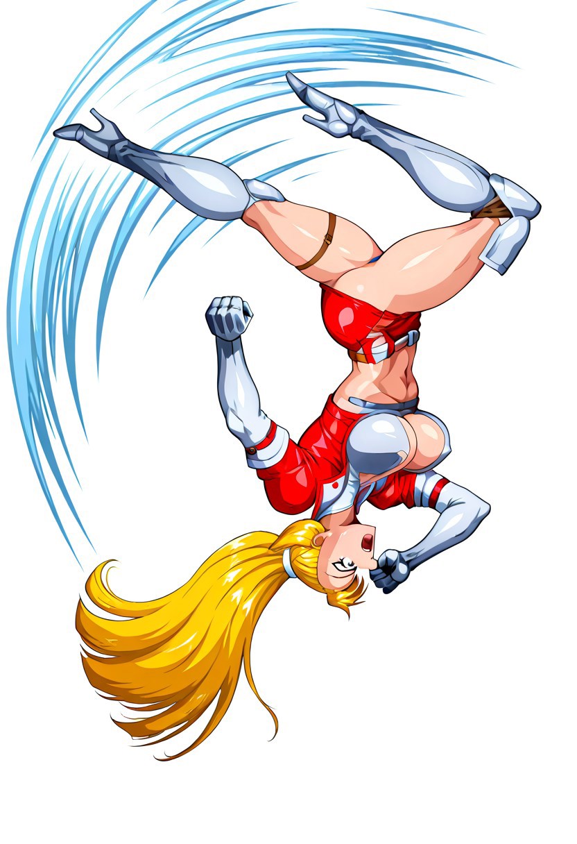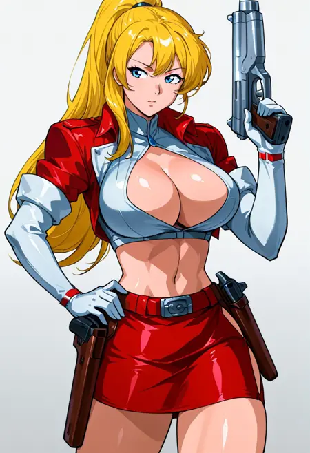 她的外观与前作截然不同,但首先,《电神魔界》中的角色原本是紫色头发,服装符合“黑骑士”(?)之名——全黑装扮;然而,转至《守护者》系列后,她改穿红色夹克、短裙和白色背心,并扎着金色马尾。因此,她完全不像一名黑骑士,反而让人想起Banpresto某位金色马尾角色的造型。