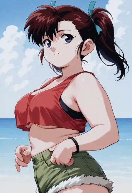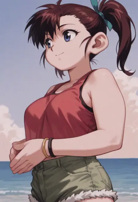 original outfit, red tank top, low-cut armhole, midriff, underboob, pendant, hexagram golden pendant, short shorts, green shorts, fur-trimmed shorts, cutoffs, shorts cutoffs, bracelet, wristband, two-tone boots, ankle boots,