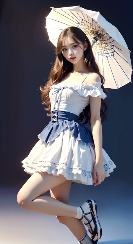 (1girl:1.3),and purple eyes,long legs,delicate skin,(Simple background, white background:1.5),full body,lora:lolitaV1:0.8,lolita,(Blue Skirt:1.3),Smile,