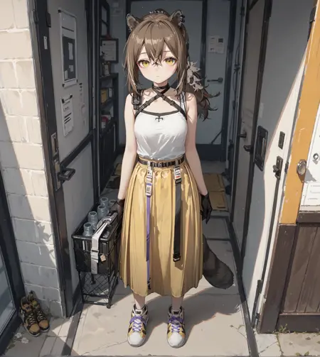 탱크탑, 재킷, 털 장식, 어깨 노출, 노랑색 스커트, 스니커즈, 초커, 머리 꽃,