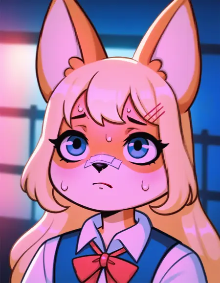 提示: masterpiece, best quality, solo, sakura-vkstickrs, orange fur, blue warm vest, short sleeves, white shirt, black skirt, red ribbon tie, long blonde hair, blue eyes.