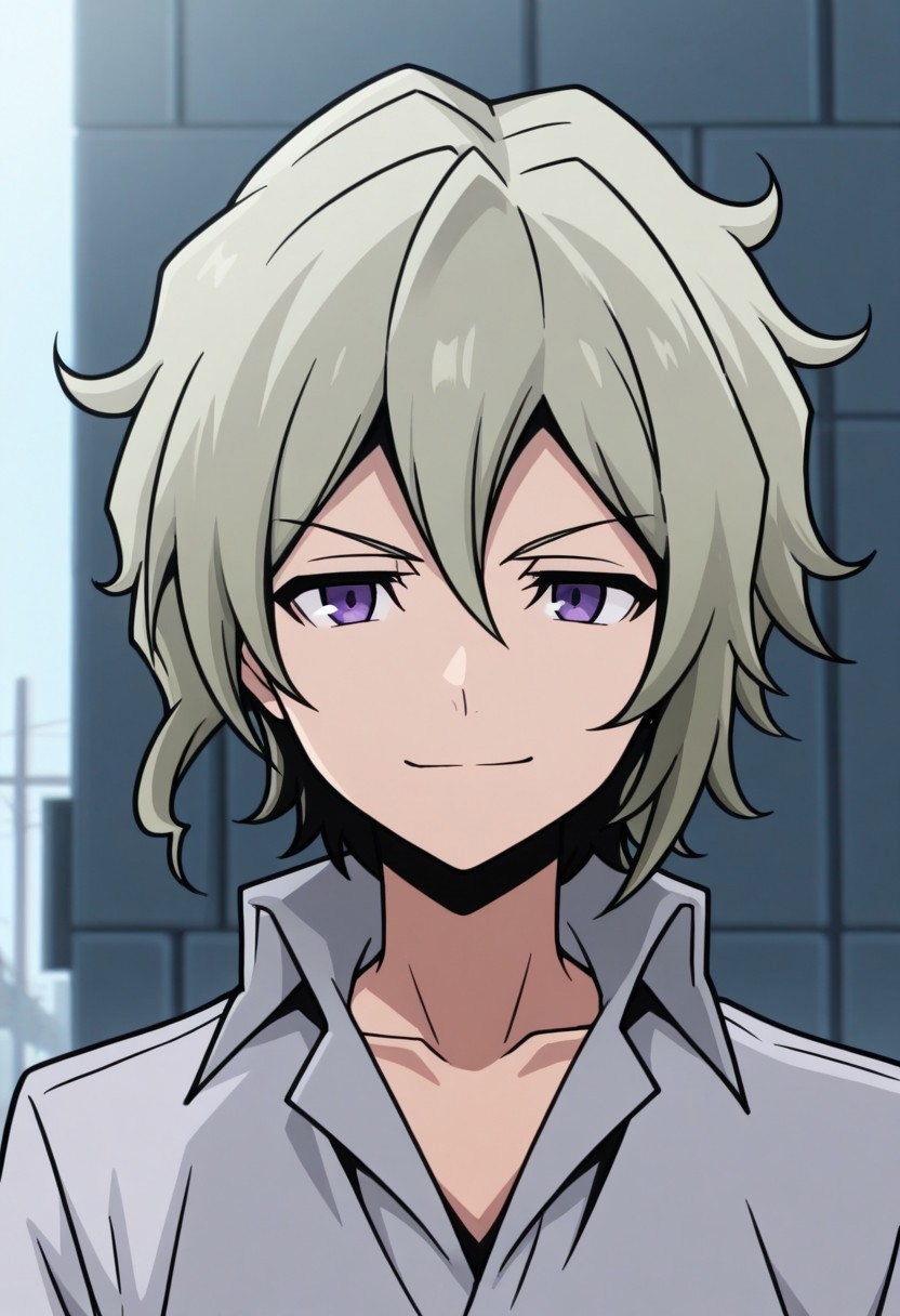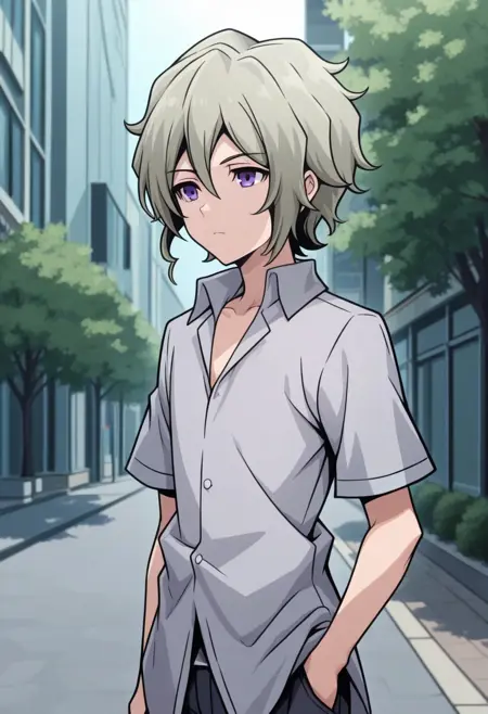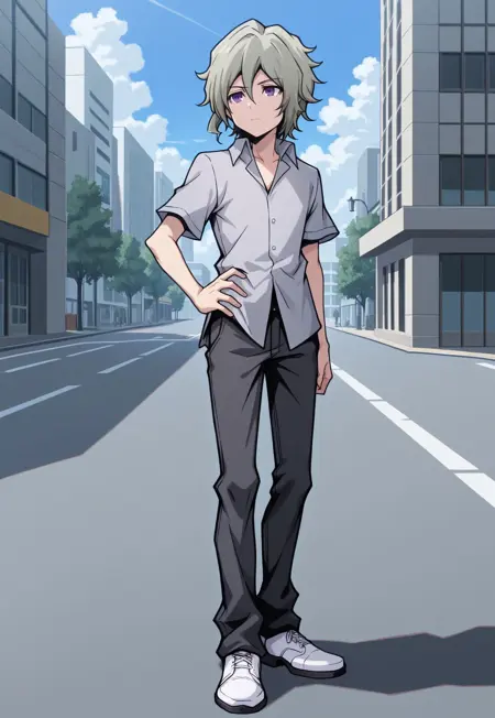 yoshiya, 1boy, male focus, solo, purple eyes, grey hair, hair between eyes, shirt, collared shirt, grey shirt, short sleeves, pants, black pants, shoes, white footwear