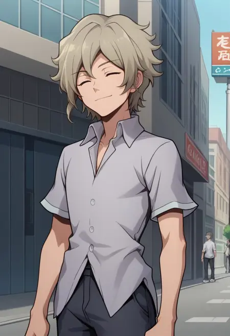 yoshiya, 1boy, 男性焦点, solo, 紫色眼睛, 灰色头发, 头发遮住眼睛, 衬衫, 有领衬衫, 灰色衬衫, 短袖, 裤子, 黑色裤子, 鞋子, 白色鞋履