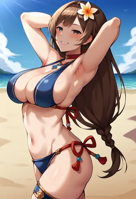 - cshabase, 낮게 묶인 긴 머리, 회색 눈, 큰 가슴, cshaswim, 머리 장식, 머리 꽃, 땋은 머리, 빨간 목걸이, 비키니, 파란 비키니, 사이드 티 이어 비키니 바지, 가슴선, 목걸이, 구슬 팔찌, 팔찌, 허벅지 스트랩, 샌들,