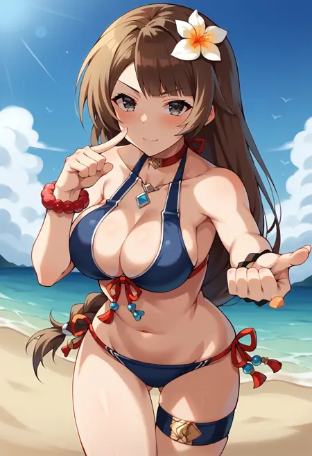 - cshabase,低绑长发,灰色眼睛,大乳房,cshaswim,发饰,头发花朵,辫子,红色项圈,比基尼,蓝色比基尼,侧系式比基尼下装,乳沟,项链,珠串手链,手链,大腿绑带,凉鞋,