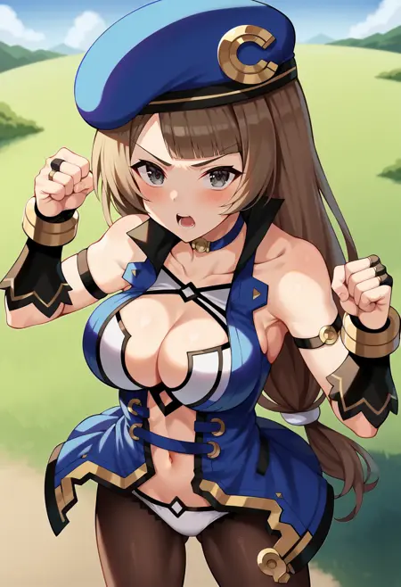 cshabase, 낮게 묶인 긴 머리, 회색 눈, 큰 가슴, cshadef, 베레모, 파란 조끼, 목걸이, 어깨 노출, 가슴선, 옷의 컷아웃, 배꼽, 보석, 장갑, 웨딩 장갑, 흰색 속옷, 갈색 팬티스타킹, 무릎 부츠, 파란 신발, 부츠, 하이힐,