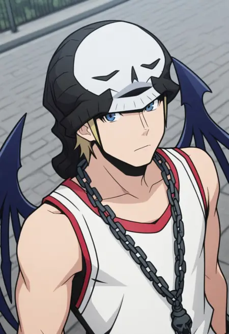 Daisukenojo, 1boy, male focus, solo, blue eyes, blonde hair, hat, beanie, black headwear, tank top, jewelry, chain necklace, bracelet, capri pants, yellow pants, chain belt, socks, shoes, sneakers, red footwear