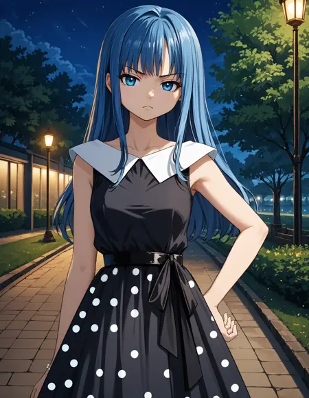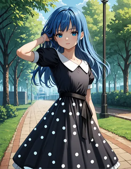休闲服装(动画版): mgrcnanamiyachiyo, nnmcsl, 长发, 黑色连衣裙, 短款黑色蓬松袖子, 带蝴蝶结的黑色腰带, 白色波点, 黑色连裤袜