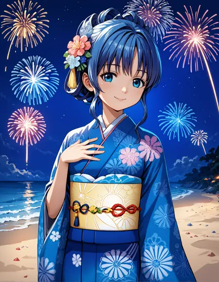 和服: mgrcnanamiyachiyo, nnmkmn, 盘发, 头饰花, 蓝色和服, 黄色腰带, 花纹图案