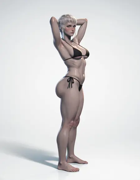 9,score_8_up,score_7_up,score_6_up,rating_explicit, 비키니, 흰 배경, 싱글, 뺨에 홍조, 가슴, 둥근 엉덩이, 부드러운 음영, 밝은 색상, 역동적인 자세, 여름 분위기, 엉덩이, 단색 배경, 겨드랑이, 팔을 머리 위로, 손은 머리 뒤에 숨김, 맨발로 시청자를 바라봄, lora:Unlocked\_Drow-000008:1 unlockeddrow -- Test Prompt.