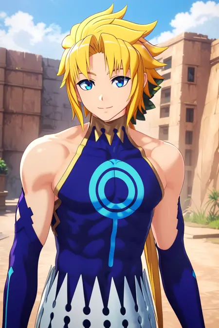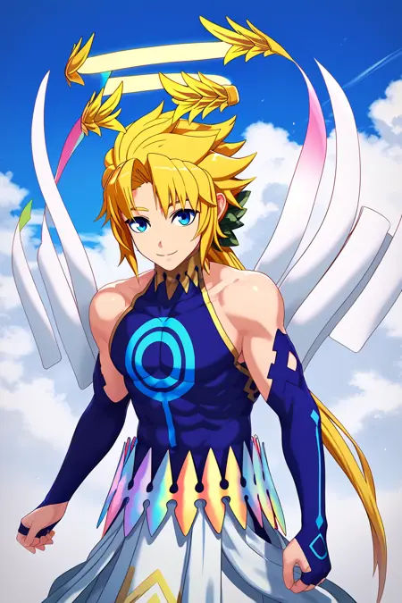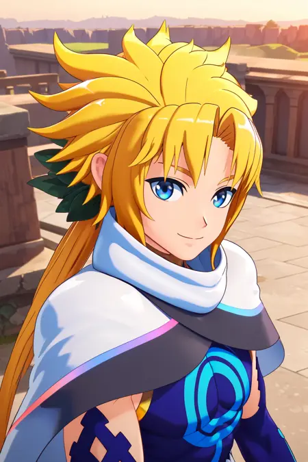 ノア、金髪、青い目、長い髪、低く結んだポニーテール、髪飾り、青いボディスーツ、プリントシャツ、肩を露出、肘まで手袋、指なし手袋、