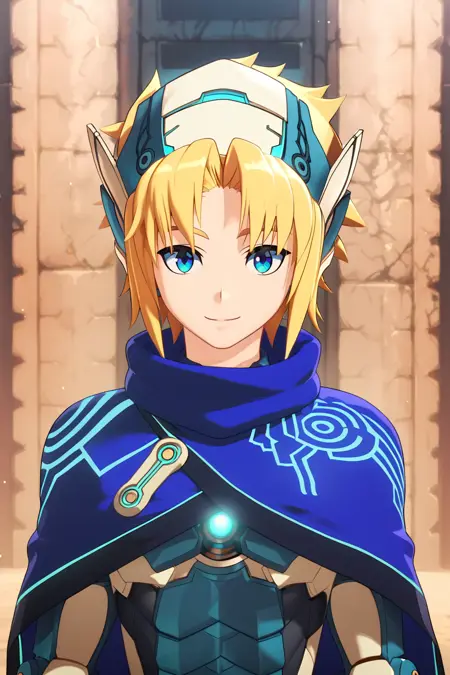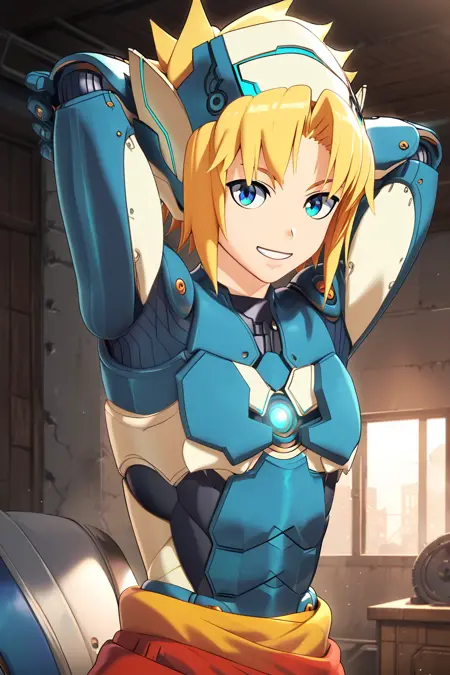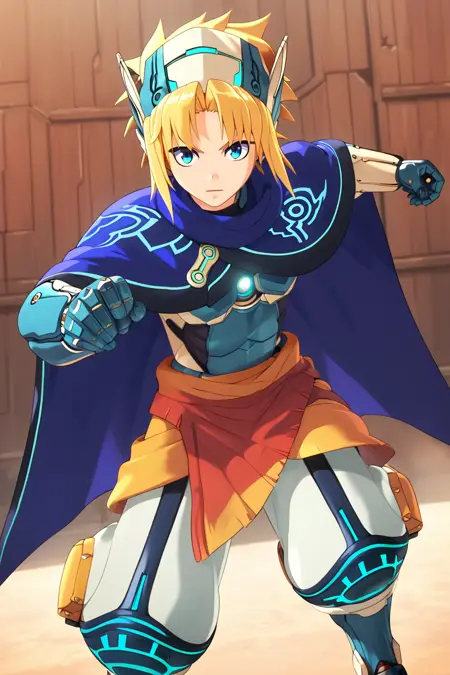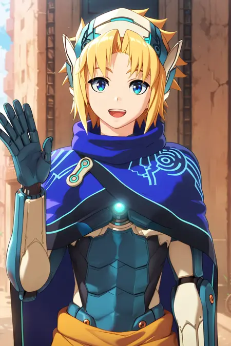 ノア、金髪、青い目、短い髪、鎧、青いショール、機械的な体、機械的な手、頭部装具、