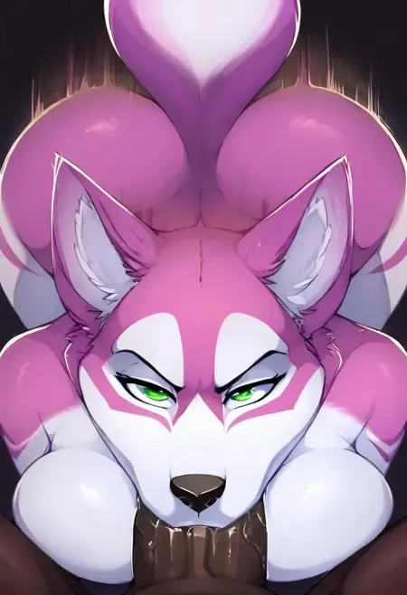 긍정적 프롬프트: TaviaS, 퓨리, 앤트로, 수컷 개, 허스키, 북극 썰매 개, 분홍색 몸, 분홍색 털, 흰색 몸, 흰색 털, 이-tonal 몸, 이-tonal 털, 초록색 눈, 검은 코, 꼬리