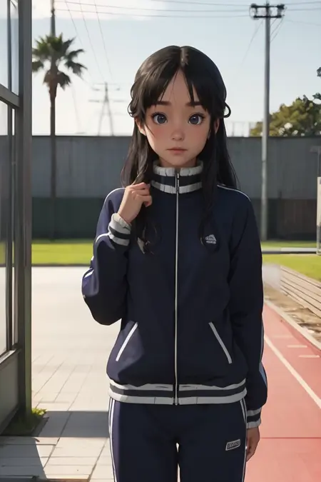 1girl, solo, long hair, black hair, grey eyes, track jacket, gym uniform, track suit, track pants