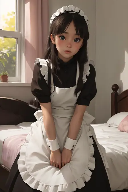 1girl, solo, long hair, black hair, hat, grey eyes, maid, maid headdress, enmaided