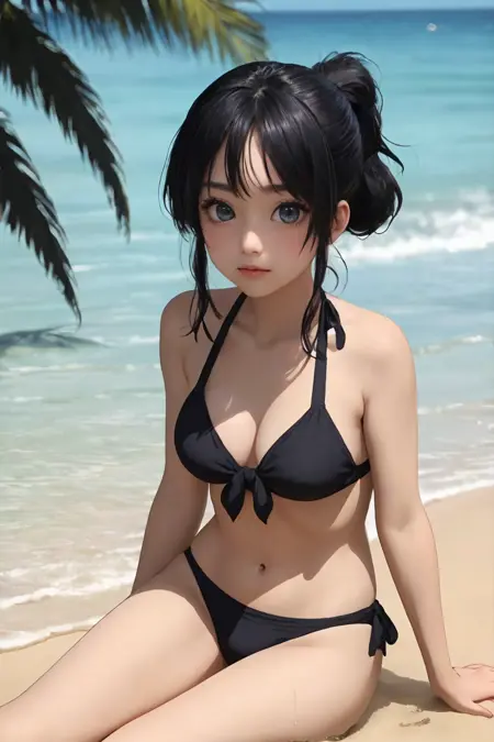 1girl, solo, long hair, black hair, grey eyes, swimsuit, black bikini, bikini, folded ponytail, alternate hairstyle, hair up