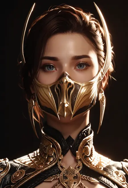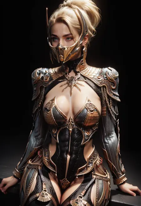 Primary: d4rkgin4rm0r, thong leotard, bikini armor:pauldrons:hip armor, shrug \(clothing\):arm guards, thigh boots, mask,