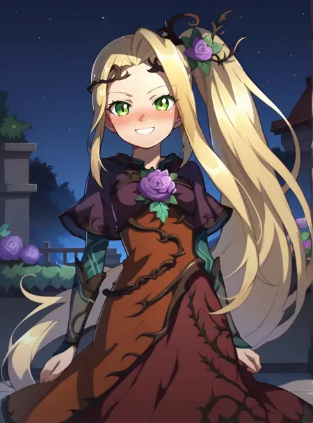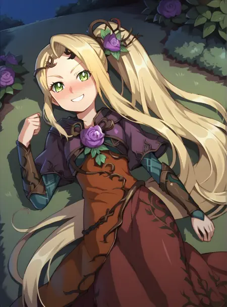 有用提示:长发,1个女孩,单独,金发,花朵,裙子,发饰,微笑,发上花朵,绿眼,非常长的头发,马尾辫