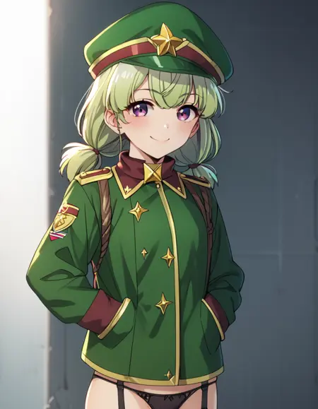Leopard, 短发, 绿发, 紫色眼睛, 低双马尾, 绿色鞋履, 军装外套, 极长袖子, 吊袜带, 魔法少女, 无裤子, 黑色内裤, 绿色头饰,