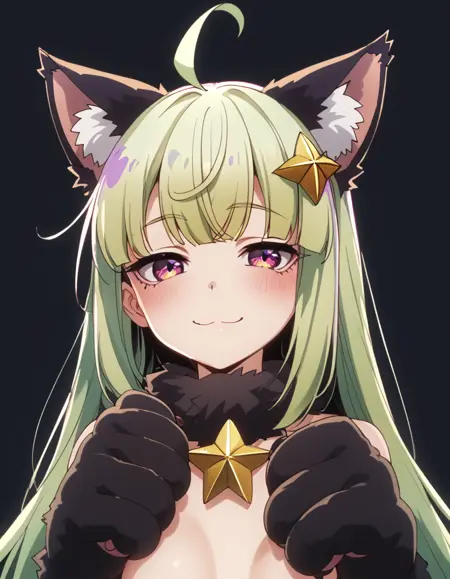 Leopard_Full, 紫色眼睛, 极长发, 天线发, 绿发, 动物耳朵绒毛, 猫耳, 完全裸体, 猫尾, 猫娘, 爪子, 动物手, 星形发饰, 钝头, 动物脚, 怪物娘,