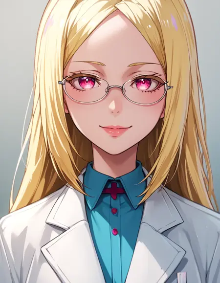 NeroAlice_Full, 长发, 金发, 眼镜, 粉色眼睛, 分开刘海, 实验室外套,