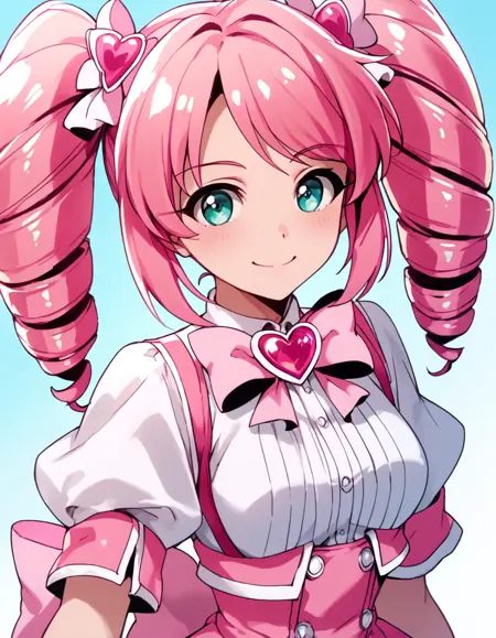 MagiaMagenta, 长发, 短裙, 粉发, 水蓝色眼睛, 钻头发, 魔法少女, 双钻头发, 粉色连衣裙,