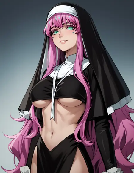 SisterGigant, 极长发, 绿色眼睛, 粉发, 紫发, 水蓝色眼睛, 面部印记, 修女, 下胸露, 侧开衩,