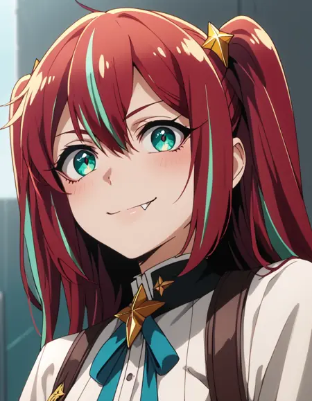 LocoMusica, 长发, 头发遮住眼睛, 双马尾, 紫发, 多彩发色, 侧发, 红发, 绿发, 条纹发, 水蓝色眼睛, 两侧上扬发, 露出獠牙,