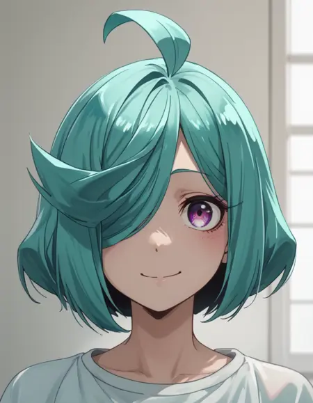 Nemo, 단발, 청록색 머리카락, 보라색 눈, 아호게, 한쪽 눈 위의 머리카락,
