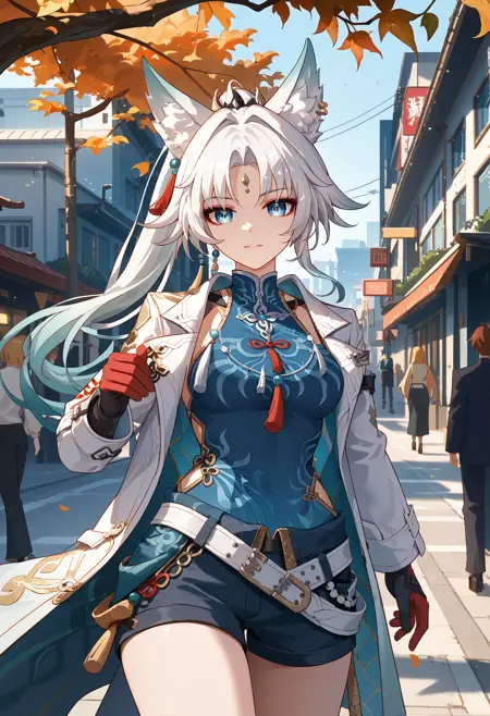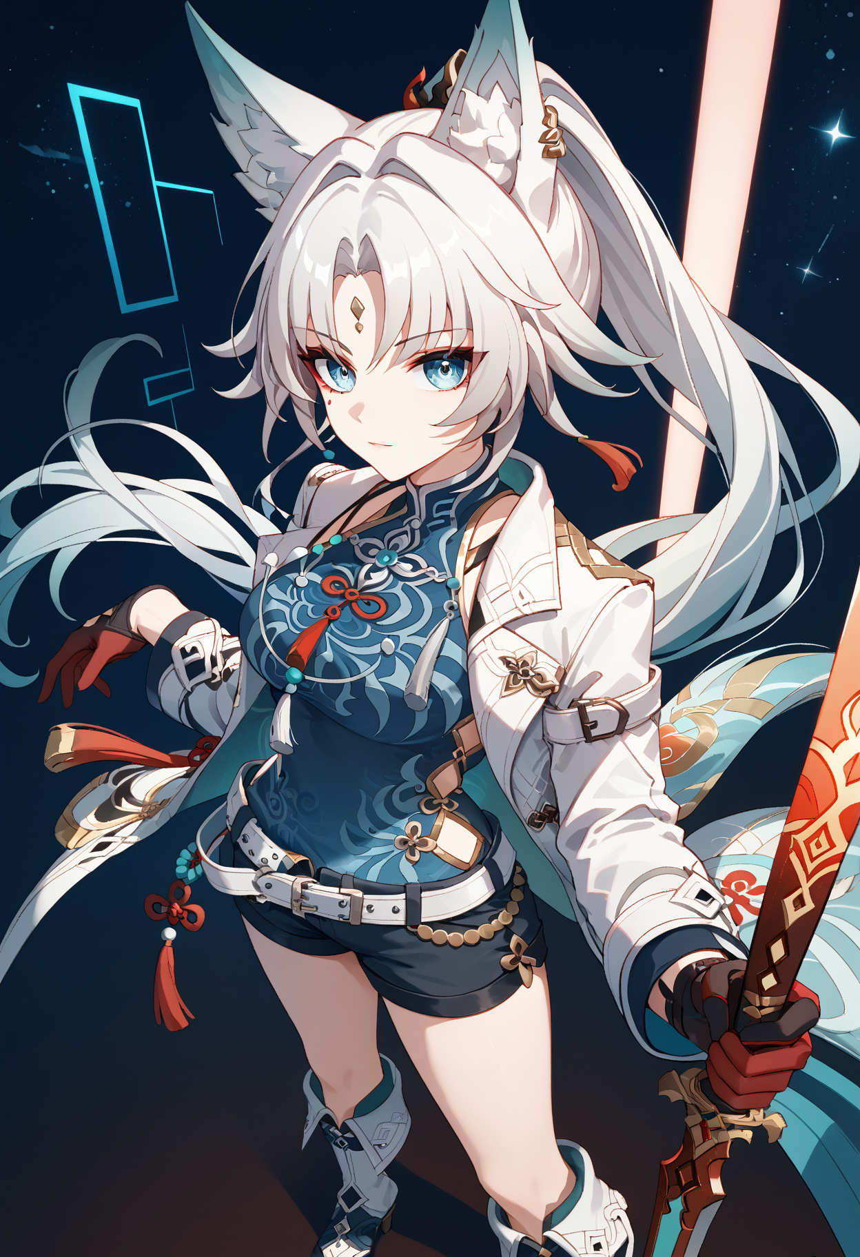 feixiao_(default), 中国风服饰, 白色夹克, 开襟服装, 短裤, 黑色短裤, 腰带, 黑色手套, 红色手套, 饰品, 过膝靴