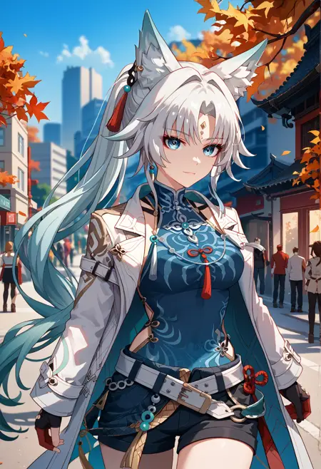 feixiao_(honkai_star_rail), 1girl, solo, 白发, 分开的刘海, 蓝眼, 长发, 狐耳, 动物耳朵绒毛, 面部标记, 马尾, 胸部