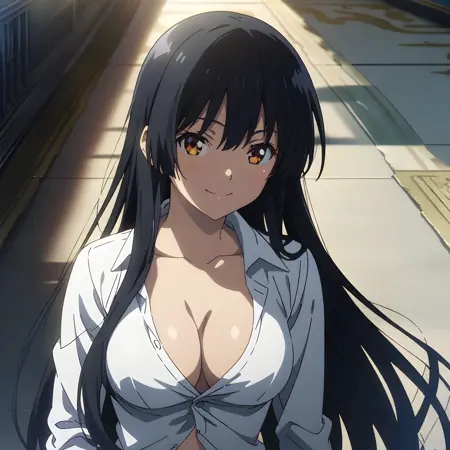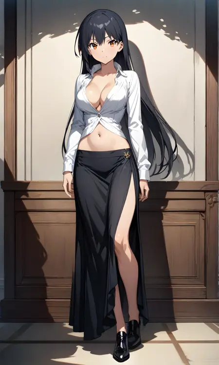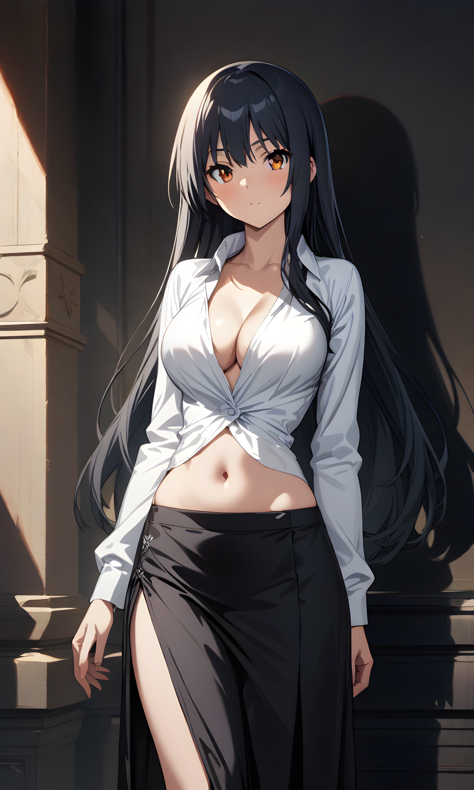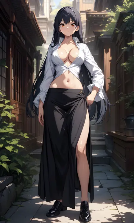 激活标签为:"akio_fudo, 黑发, 长发, 橙色眼睛, 中等胸部, 白色衬衫, 乳沟, 肚脐, 黑色裙子, 长裙, 侧切裙, 黑色鞋子"