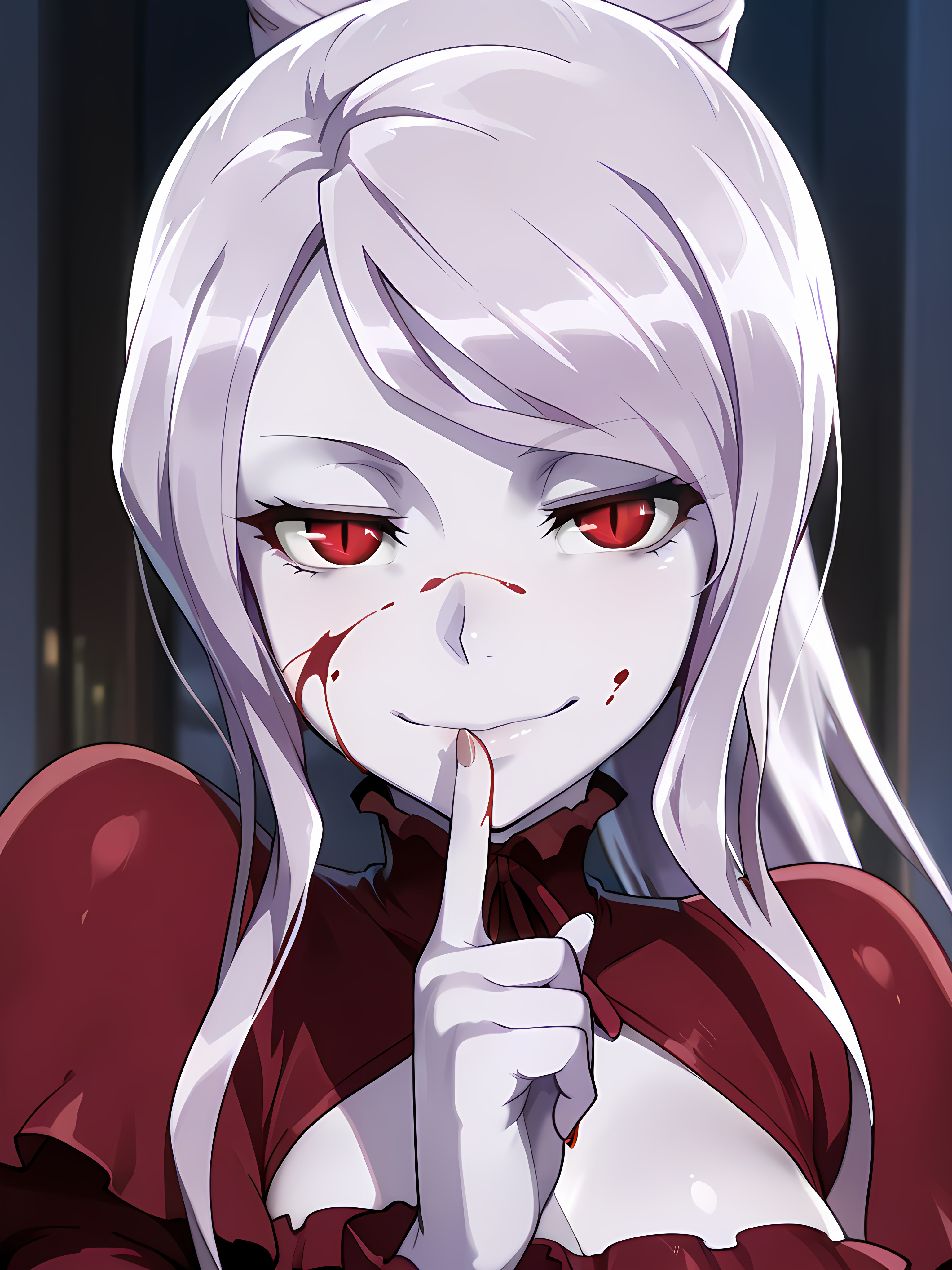 shalltear, bangs,red eyes, slit pupils, long silver hair,ponytail,colored skin, pale skin, monster girl,vampire