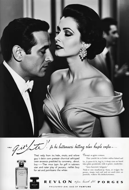 *이 이미지는 20세기 초 광고 예술에서 흔히 볼 수 있는 고전적이고 세밀하며 생생한 스타일로 묘사된 NAME 향수의 빈티지 광고입니다.