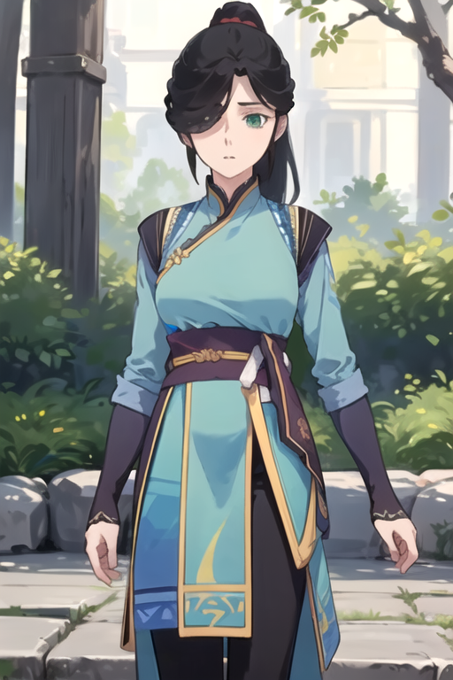 FuYinXuanYuan, 1girl, solo, long hair, black hair, long sleeves, green hanfu, green eyes, high ponytail, belt, black pants, hair over one eye, sash,