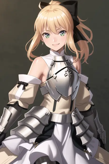 トリガー語は Saber Lily です。第一の昇華のarmor(鎧)を出したい場合は、breastplate, armored dress を追加してください。ただし、画像の大半が第二または第三の昇華のものだったため、完璧には動作しません。ただし、生成を繰り返すことで得られる可能性もあります。