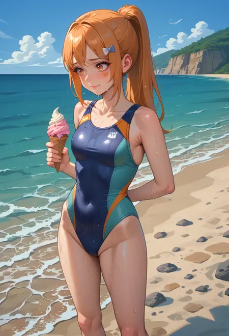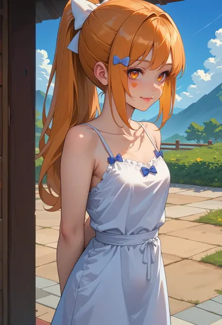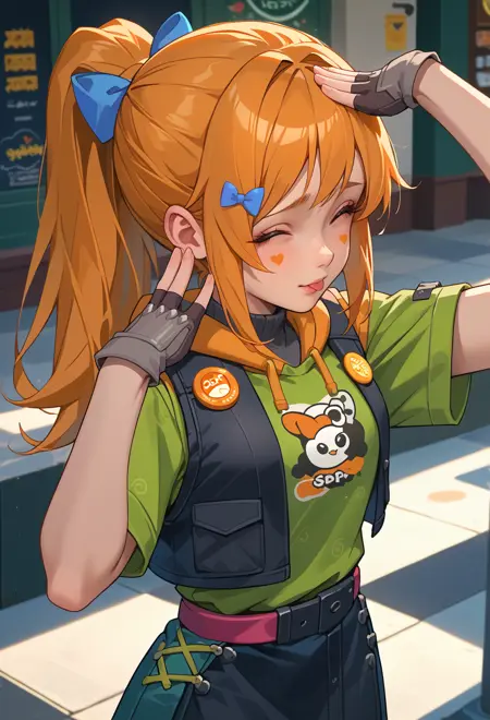 オレンジ色の目、オレンジ色の髪、長い髪、ポニーテール、サイドロックス、顔の模様、ハート型の顔の模様、