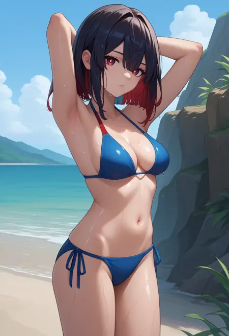 트리거 + 외모: xueyi, 가슴 문신, 색상 내발, 검은 머리, 빨간 머리, 파란 머리, 빨간 눈